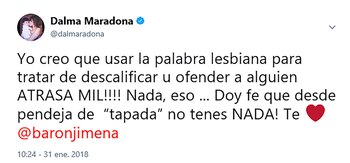 Algunas famosas repudiaron estos dichos, como Dalma Maradona que salió a defender a la actriz en Twitter: "Yo creo que usar la palabra lesbiana para tratar de descalificar u ofender a alguien atrasa mil. Nada, eso … Doy fe que desde pendeja de "tapada" no tenés nada. Te ❤️@baronjimena".