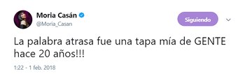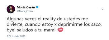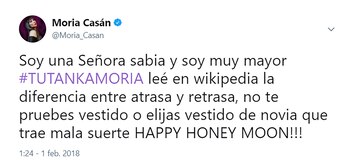 "Soy una Señora sabia y soy muy mayor #TUTANKAMORIA. Leé en Wikipedia la diferencia entre atrasa y retrasa, no te pruebes vestido o elijas vestido de novia que trae mala suerte ¡¡¡Happy honeymoon!!!", escribió Casán en Twitter. "Algunas veces el reality de ustedes me divierte, cuando estoy por deprimirme los saco, ¡bye! saludos a tu mami", finalizó.