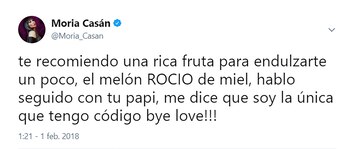 Luego, la diva, con tono irónico, le hizo una sugerencia: "Te recomiendo una rica fruta para endulzarte un poco, el melón ROCÍO de miel, hablo seguido con tu papi, me dice que soy la única que tengo código. ¡¡¡Bye love!!!". Además, le recordó: "¡¡¡La palabra atrasa fue una tapa mía de GENTE hace 20 años!!!".