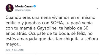 "Cuando eras una nena vivíamos en el mismo edificio y jugabas con Sofía. ¡Tu papá venía con tu mamá a Gaysoline! Te hablo de 30 años atrás. Ocupate de tu boda, sé feliz, no estés amargada que das tan chiquita a señora mayor…", disparó Moria contra la hija de Diego Maradona y Claudia Villafañe.
