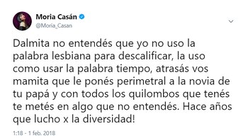 La Lengua Karateca no tardó en responderle a la hija del director técnico de Al Fujairah: "Dalmita no entendés que yo no uso la palabra lesbiana para descalificar, la uso como usar la palabra tiempo, atrasás vos mamita, que le ponés perimetral a la novia de tu papá y con todos los quilombos que tenés te metés en algo que no entendés. ¡Hace años que lucho por la diversidad!".