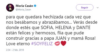 Por último, le agradeció por su presente con su hija y sus nietos: "Verás desde donde estés que SOFIA, HELENA y DANTE están felices y hermosos, familia que pude construir gracias a papá JUAN y mamá Rosa. Love eterno #SOYFELIZ".