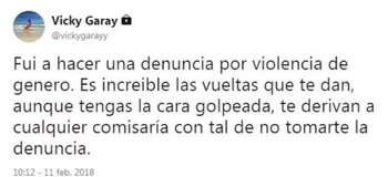 "Fui a hacer una denuncia por violencia de género. Es increíble las vueltas que te dan, aunque tengas la cara golpeada, te derivan a cualquier comisaría con tal de no tomarte la denuncia", escribió en la red social.