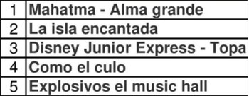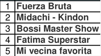 Por su parte, en Villa Carlos Paz el podio estuvo encabezado por Mahatma – Alma Grande (diez funciones). Luego se posicionaron La isla encantada (diez funciones), Disney Junior Express – Topa (seis funciones), Como el culo (ocho funciones) y Explosivos, el music hall (ocho funciones).
