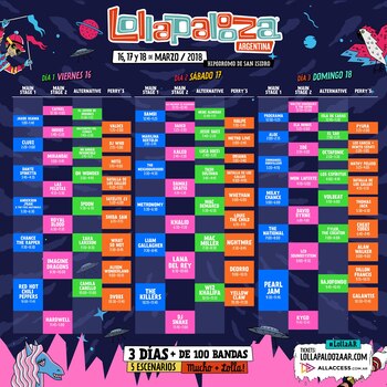 La espera terminó. A menos de 20 días del comienzo de su quinta edición, Lollapalooza Argentina anunció los horarios de los shows de los más de 100 artistas que participarán en el festival los próximos viernes 16, sábado 17 y domingo 18 de marzo.