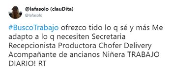 Bajo el hashtag "Necesito trabajo diario urgente", la locutora le pidió a sus casi 8 mil seguidores de Twitter que compartieran el mensaje en que asegura que aceptará hacer cualquier trabajo: "No importa si no es de mi profesión. Puedo hacer delivery, chofer, cuidar niños, abuelos, lectora a domicilio, recepcionista, secretaria. ¿Me dan RT? Es urgente".