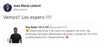 A dos meses de haber terminado Este es el Show, José María Listorti vuelve a trabajar y será como conductor de Re tarde, por Pop Radio que se emitirá de lunes a viernes de 19 a 21 horas.