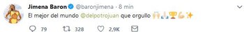 Jimena Barón, que se separó de Del Potro a mediados de febrero, le dedicó un breve pero tierno halago a través de su cuenta en Twitter. De esta manera, demostró que su relación terminó en buenos términos.