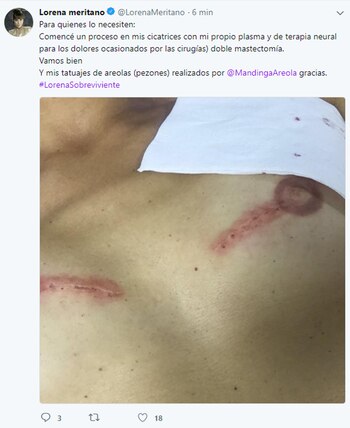 "Para quienes lo necesiten: comencé un proceso en mis cicatrices con mi propio plasma y de terapia neural para los dolores ocasionados por las cirugías doble mastectomía. Vamos bien. Y mis tatuajes de areolas (pezones) realizados por @MandingaAreola, gracias. #LorenaSobreviviente", escribió la actriz en su cuenta de Twitter, donde cuenta con 190 mil seguidores.