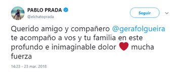 Pablo El Chato Prada también le dedicó unas conmovedoras palabras a su compañero de trabajo. "Querido amigo y compañero te acompaño a vos y tu familia en este profundo e inimaginable dolor. Mucha fuerza", escribió en su cuenta de Twitter el productor de ShowMatch a su colega.
