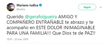 Mariano Iúdica envió también su apoyo: "Querido amigo y compañero entrañable, te abrazo y acompaño en este dolor inimaginable para una familia. Que Dios te de paz".