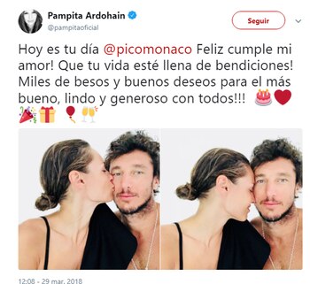 Pico Mónaco cumple hoy 34 años y como no podía ser de otra manera su novia, Carolina Ardohain, le mandó un afectuoso saludo a través de las redes sociales en esta fecha tan especial.
