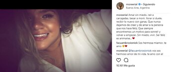 More está de novia con el futbolista Facundo Ambrosioni, quien la acompañó en el hopsital en el que fue intervenida el martes pasado. "Que siempre encontremos un motivo para sonreír y volver a empezar. Sin miedo, vivir. Ser feliz es animarse…", agregó la hija de Rial en su cuenta de red social en la que tiene casi 800 mil seguidores.