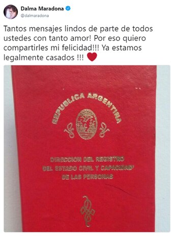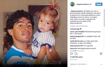"Había una vez un joven llamado Andrés Caldarelli, que llamó al padre de su novia para pedirle su mano. Caballeros como mi yerno, no existen más. ¡Estoy muy feliz y orgulloso de contarles que se casa mi hija Dalma Maradona", dijo el año pasado el Diez, aún sin el consentimiento de ella para realizar el anuncio.