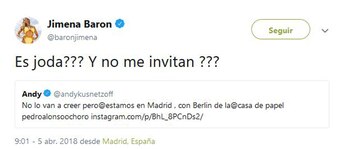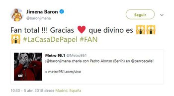 Jimena Barón, confesa fanática de la serie, se encuentra en España grabando su nuevo videoclip y manifestó su indignación porque no la invitaron a presenciar semejante entrevista. "¿Es joda? ¿Y no me invitan?", escribió en Twitter, ante el anuncio de Kusnetzoff sobre su encuentro con Alonso. Al ver el mensaje, la producción del ciclo se contactó con ella y salió al aire, en medio de la nota.