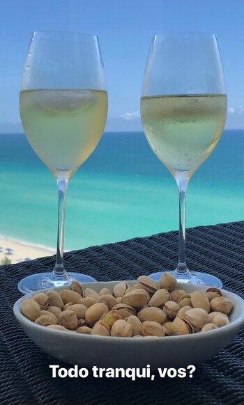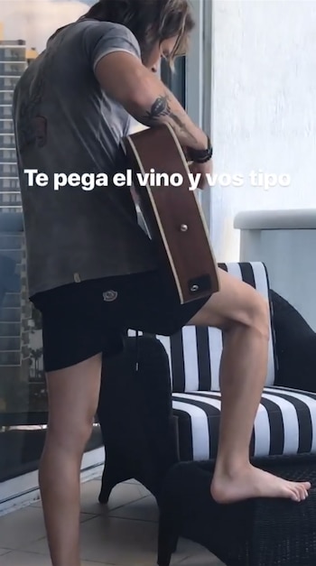 Las mismas copas de vino, el mismo cielo, el mismo mar… Están juntos, ¿qué duda cabe?, tanto aquí, en Buenos Aires, como allí, en Miami. Y por si estas dos postales resultaran insuficientes -más propias del trabajo de un stalkeador-, Candelaria confirmó la relación -que nació luego de que los presentara Francisco Tinelli– sacándole esta vez ella una foto a él. Justo cuando, guitarra en brazos, Luca improvisaba "El Sensei", una canción de Las Pastillas del Abuelo.
