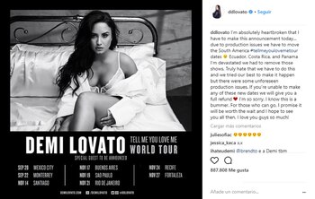 "Estoy con el corazón roto por tener que hacer este anuncio hoy. Debido a cuestiones de producción tenemos que mover las fechas de la gira sudamericana Tell me you love me", escribió la cantante sobre el tour que lleva el nombre de su último disco.