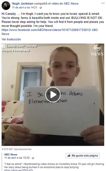 El protagonista de X-Men, Van Helsing y Australia decidió escribirle un mensaje de apoyo a la pequeña por Facebook: "Hola Cassidy. Soy Hugh. Quiero que sepas que eres adorable, especial e inteligente. Eres fuerte, divertida y preciosa tanto por dentro como por fuera. ¡El bullying no está bien! Por favor, nunca dejes de pedir ayuda. La encontrarás en las personas y los lugares en los que no lo creas posible. Yo soy tu amigo".