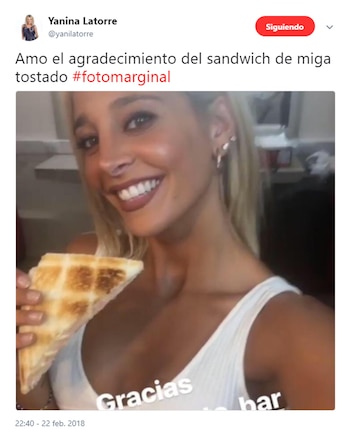 "Amo el agradecimiento del sándwich de miga tostado. Foto marginal", había escrito Latorre en su cuenta de Twitter a lo que Sol muy segura le respondió: "Ojalá no vivas de las apariencias. Agradezco a la casa que todas las noches nos da comida, que con todo el esfuerzo nos preparan cosas riquísimas. Hay que ser agradecido y a la gente un posteo los ayuda un montón".