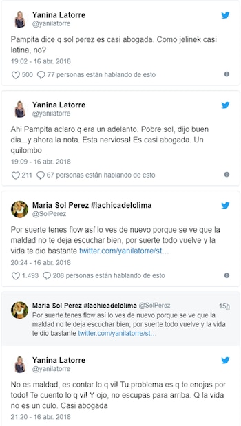 Yanina Latorre y Sol Pérez volvieron a cruzarse en las redes sociales luego de que la panelista de Los ángeles de la mañana se riera de la ex Bailando porque es "casi abogada". Ni lenta ni perezosa, la "chica del clima" no se calló nada y respondió.