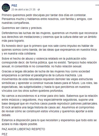 "Sobre el hecho de abuso y violencia relatado en la publicación sólo corresponde decir, de forma pública, que no existió. Tampoco hubo relación sexual, ni consentida ni no consentida: no hubo relación sexual". Así, con esas palabras, el grupo Pez se refería, desde su cuenta de Facebook, a la denuncia de abuso sexual por parte de una fan contra el baterista de la banda, Franco Salvador.