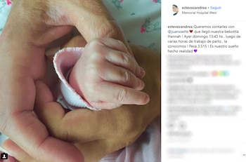 Nació Hanna, la primera hija de Andrea Estévez, fruto de su relación con Juan Manuel García. La beba llegó al mundo luego de catorce horas de trabajo de parto a las 13.43 del domingo, hora en Estados Unidos, en la clínica Memorial Hospital West, de Miami y pesó 3,515 kilos, según la flamante mamá contó a Teleshow.
