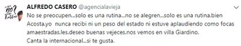 Por otra parte, en otro tuit, el actor llevó tranquilidad a sus seguidores por su actual estado de salud: "No se preocupen…solo es una rutina…no se alegren…solo es una rutina. Bien Acosta. Yo nunca recibí ni un peso del estado, ni estuve aplaudiendo como focas amaestradas. Les deseo buenas vejeces. Nos vemos en Villa Giardino.
