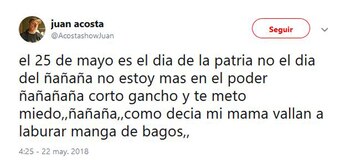 A través de un mensaje, explicó: "El 25 de mayo es el día de la Patria, no el día del ñañaña no estoy más en el poder ñañaña corto gancho y meto miedo ñañaña. Como decía mi mamá: 'Vayan a laburar, manga de vagos'".