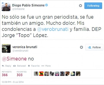 El Topo estaba en Brasil trabajando para el diario Olé y Radio La Red. Veronika también había viajado, pero como corresponsal del diario español Marca. Y supo de la tragedia de su esposo por un mensaje que el técnico Diego Simeone escribió en Twitter, despidiendo al periodista (viejo conocido suyo) y acercando sus condolencias a la viuda.