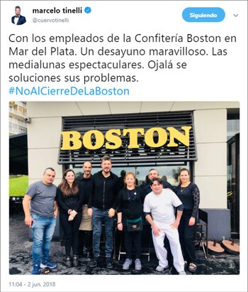 El sábado, antes de comenzar con una nueva tanda de reuniones laborales, Tinelli desayunó en la Confitería Boston, frente al mar. Y dejó un posteo en su Twitter donde deseó que "se solucionen los problemas" de los empleados del histórico comercio, con quienes se tomó una foto: