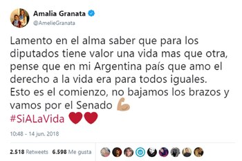 Amalia Granata es otra de las famosas que se comprometieron con la campaña en contra de la legalización del aborto y también expresó su bronca por el resultado de este jueves: "Lamento en el alma saber que para los diputados tiene valor una vida más que otra. Pensé que en mi Argentina, país que amo, el derecho a la vida era para todos iguales. Esto es el comienzo, no bajamos los brazos y vamos por el Senado. #SiALaVida".