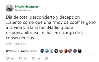 Recién llegada de Miami, a donde viajó junto a su reciente pareja Matías Tasín, Nicole se mostró dolida por la resolución. "Recuerden que además de mujeres estamos hablando de bebés. El proyecto habilita a practicar el aborto hasta el noveno mes de embarazo. Dónde dejaron el corazón? #CuidemoslasDosVidas", había dicho la modelo en el video que se difundió días antes del debate.
