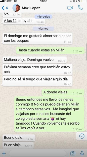 Allí se puede leer que López le pide ver a los niños por el Día del Padre y Wanda le pregunta hasta cuándo estará de viaje. "El domingo vuelvo. Próxima semana creo que también estoy acá (por Milán, donde viven Wanda e Icardi), pero no sé si tengo que viajar algún día", le responde.