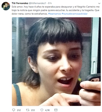 Hoy, su papá le dedicó un tierno y emotivo mensaje en las redes sociales. En su cuenta de Twitter, escribió, junto a una foto de su hija: "Sole amor, hoy hace 4 años te esperaba para desayunar y el Negrito Carneiro me trajo la noticia que ningún padre quiere escuchar, tu accidente y la tragedia. Que dolor nena, como te extrañamos. #teamamos #nuncatevamosaolvidar".