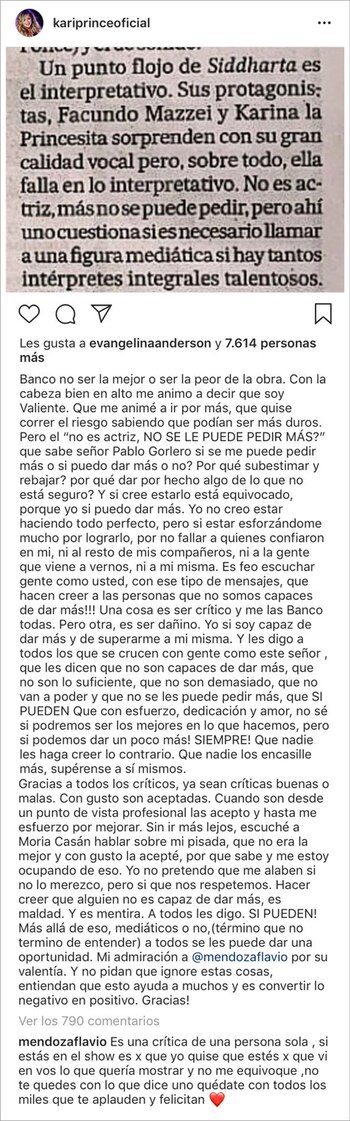 "Una cosa es ser crítico, pero otra es ser dañino". Al pie de una foto que tomó al fragmento de la crítica de Siddharta donde se habla de ella -y no de la mejor manera-, Karina La Princesita Tejeda realizó un largo descargo en su cuenta de Instagram. Y aquella frase inicial es la esencia de su enojo.