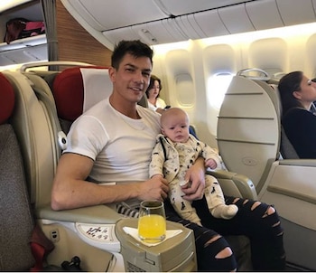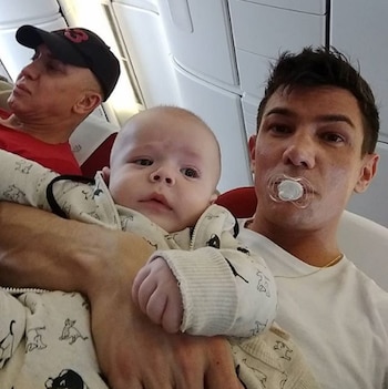 Una de las imágenes, tomada en el avión, demuestra a las claras lo sólida que se encuentra la pareja. Allí se lo ve a Daniel cargando en sus brazos al pequeño Dionisio, para que no altere la tranquilidad de la primera clase. ¡Y hasta usando su chupete para una divertida selfie!