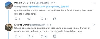 "¡Qué bronca! Me pasó lo mismo… ¡no podía ser ese el final! Ahora quiero saber cuál era el verdadero!", indagó otro usuario, que recibió la respuesta del protagonista: "Faltaba poco igual… no perdiste gran cosa… sólo que después veías a Truman en Canadá, en casa de Tomás, y con sus hijos jugando todos felices, eso".