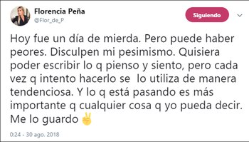 "Hoy fue un día de mierda. Pero puede haber peores. Disculpen mi pesimismo", se sinceró la actriz en su cuenta oficial de Twitter ya en la madrugada del jueves, cuando muchos usuarios expresaban sus opiniones sobre los problemas económicos que afronta el Gobierno.
