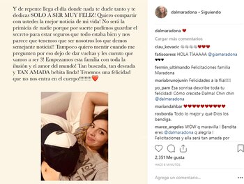 Hace apenas poco más de cinco meses concretaba su unión con su novio, Andrés Caldarelli. Y aunque en su momento la propia Dalma Maradona había dicho que quería esperar al año próximo para ser mamá, la hija mayor del Diez acaba de anunciar en su cuenta de Instagram que está en "la dulce espera".