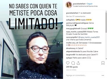 La imagen recibió cientos de comentarios, de los cuales varios alertaban que el mensaje sería para Cabré. Comentarios que Stefani no respondió ni desmintió. Incluso, después de la repercusión de su posteo en Intrusos publicó en Instagram Stories una nominación a un premio, como mejor actriz protagónica de comedia por su papel en la obra Salvajes. Sobre su anterior posteo, decidió resguardarse y no emitir opinión al respecto.
