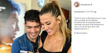 En las últimas horas, Barón compartió una postal junto a su ex hablando del film que se estrenará el próximo 4 de octubre en todos los cines de la Argentina. "Y todo mi amor a Rodrigo Romero que hizo un trabajo de otro planeta. Así salimos de ver la película recién. Vos tenés una cita el 4 de Octubre en el cine y va a ser la mejor de tu vida El Potro Rodrigo", dice el mensaje que está acompañado de una imagen cómplice entre la actriz y el actor.