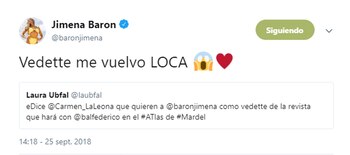 "Dice @Carmen_LaLeona que quieren a @baronjimena como vedette de la revista que hará con @balfederico en el #Atlas de #Mardel", escribió la periodista.