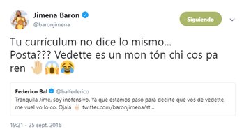 Fue ahí cuando, rápida de reflejos, Jime le contestó al ex de Laurita Fernández. "Tu currículum no dice lo mismo… ¿¿¿Posta??? Vedette es un montón chicos paren", lanzó.