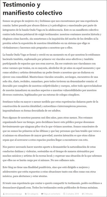 "Somos un grupo de mujeres cis (cisgénero) y lesbianas que nos encontramos por una experiencia común: haber pasado por abusos físicos y/o psicológicos y emocionales por parte de integrantes de la banda Onda Vaga en la adolescencia". De esa manera —breve, concisa y precisa— se inicia el "manifiesto colectivo" que busca recabar testimonios de presuntas víctimas de los miembros de esta banda de folk argentina fundada en 2007.