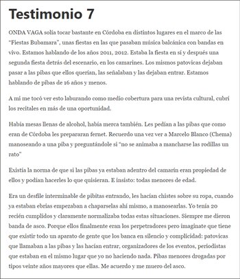 Cuentan entonces que Onda Vaga "se formó y creció" al mismo tiempo que lo hacían ellas, seguidoras del grupo, que estaban "explorando por primera vez vínculos sexo-afectivos". Allí, según las denuncias, surgieron los abusos. "Mantuvimos vínculos sexuales, noviazgos, encuentros de una sola cita, chats, recitales, camarines, pero todos tuvieron un denominador común: el descuido por completo de nuestras subjetividades y cuerpos, aprovechándose de nuestra inmadurez, legitimados por un entorno de colegas cómplices".