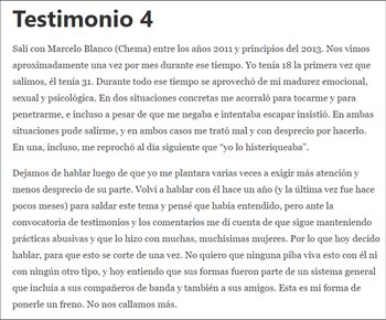 Justamente una de las jóvenes, al relatar el abuso sufrido, remite al caso de los músicos del grupo de rock Pez, que tras una serie de acusaciones similares, terminaron admitiendo los encuentros íntimos con quienes los denunciaron. Sin embargo, hasta el momento ningún integrante de Onda Vaga —por estos días de gira por Europa— se manifestó al respecto.