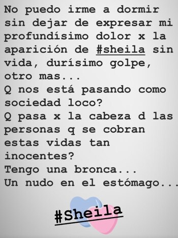 "No puedo irme a dormir sin dejar de expresar mi profundísimo dolor por la aparición de Sheila sin vida. Durísimo golpe, otro más… ¿Qué nos está pasando como sociedad, loco? ¿Qué pasa por la cabeza de las personas que se cobran estas vidas tan inocentes? Tengo una bronca… Un nudo en el estómago…", escribió el actual coach de La Voz Argentina en una historia de su cuenta de Instagram.