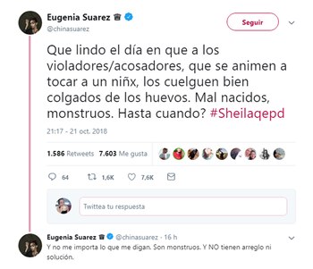 "Qué lindo el día en que a los violadores/acosadores, que se animen a tocar a un niñx, los cuelguen bien colgados de los huevos. Mal nacidos, monstruos. Hasta cuándo", escribió la actriz en Twitter, a días de haberse conocido el fatal descenlace.
