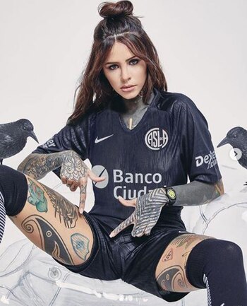 Pero este lunes, en el día de la presentación de la nueva indumentaria del club, Cande posó con la nueva camiseta del equipo y mostró que el escudo se encuentra en una pierna.