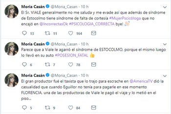 Luego siguió: "El señor Viale generalmente no me saluda y me evade así que además de síndrome de Estocolmo tiene síndrome de falta de cortesía #MujerPscicóloga que no encajó en Incorrectas".